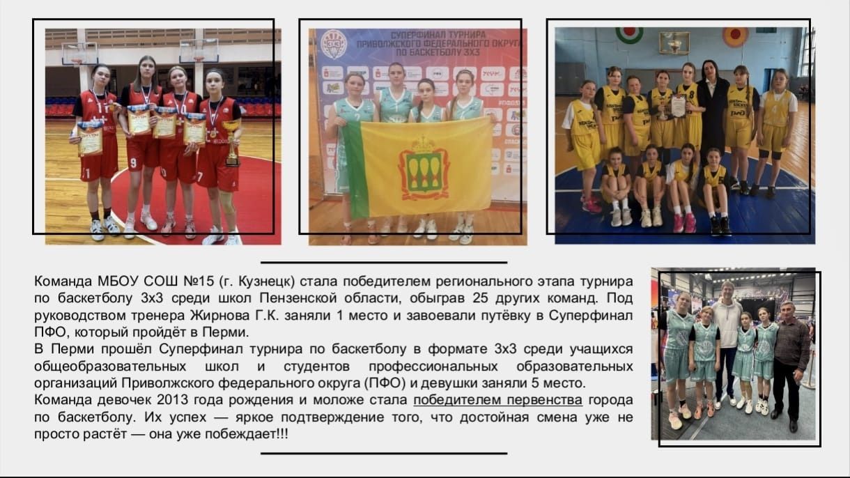 14 апреля 2025 года в спортивном центре «Юность» завершился региональный этап соревнований турнира Приволжского федерального округа по баскетболу 3х3 среди обучающихся общеобразовательных организаций. За победу боролись команды 26 муниципальных образований Пензенской области.По итогам матчей 1 место заняла команда г. Кузнецка МБОУ СОШ N15. Наши девушки стали лучшими в Пензенской области!!! Поздравляем: