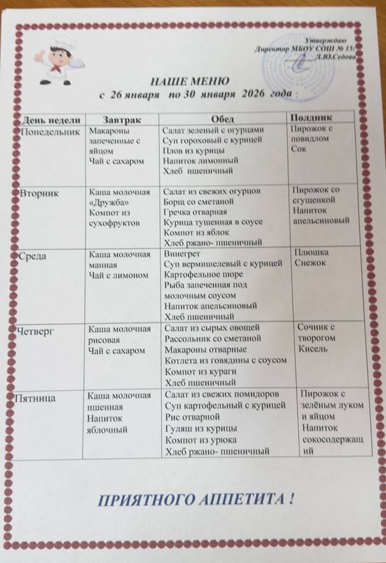 1) ознакомились с меню на день и его соответствием утверждённым нормам,