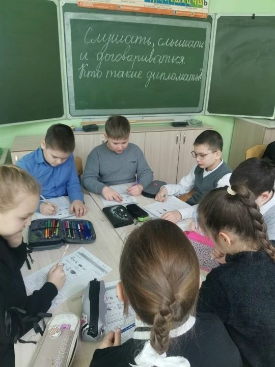 После окончания линейки ученики прошли на внеурочное занятие «Разговоры о важном» по теме «Слушать, слышать и договариваться. Кто такие дипломаты?»